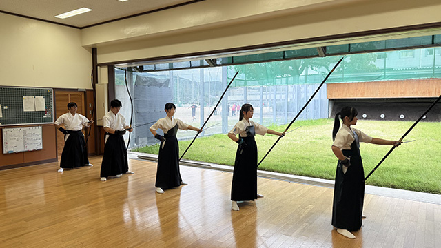 弓道部は、正射必中をモットーに日々の練習に取り組んでいます。正射必中とは「正しい射をすれば必ず中(あた)る。」という意味です。その正しい射法で弓を引くために、先輩から後輩へアドバイスをしたり、朝倉高校OBである上段者の方から教わったりしています。