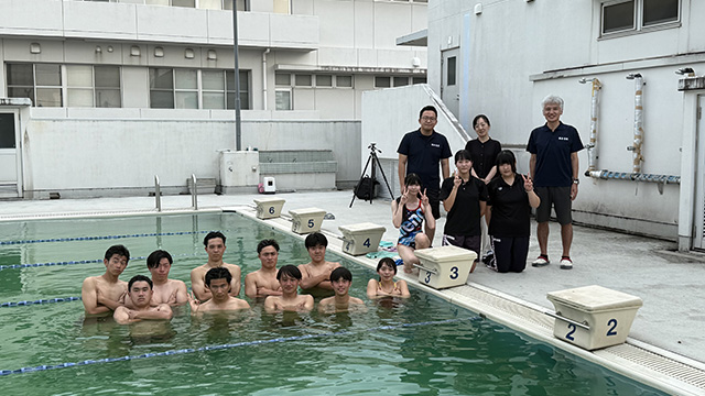 活動内容は、夏は月曜から土曜は学校のプールで泳ぎの基礎から飛び込みなどの試合に向けた練習をしています。また、2泊3日程度の合宿を行って、ベスト記録の更新や九州大会出場などを達成するためにみんなで励まし合いながら自分を追い込んでいます。