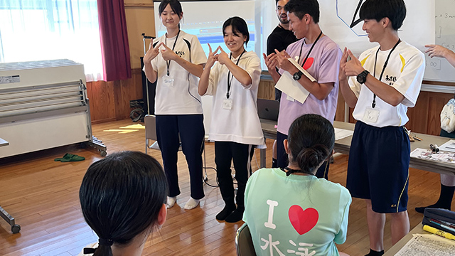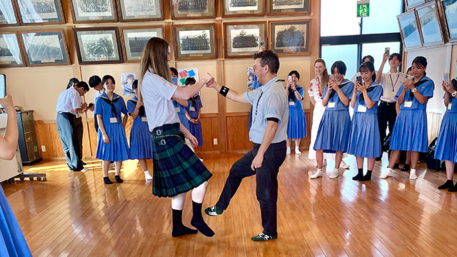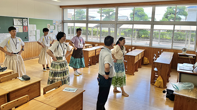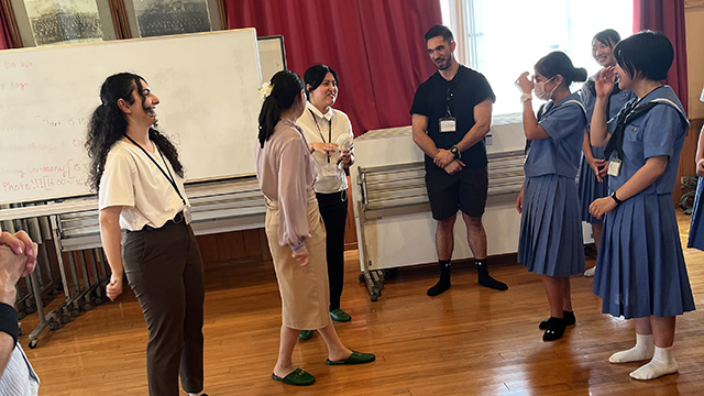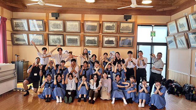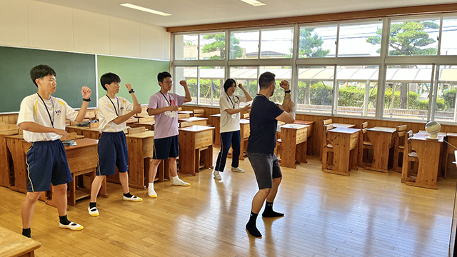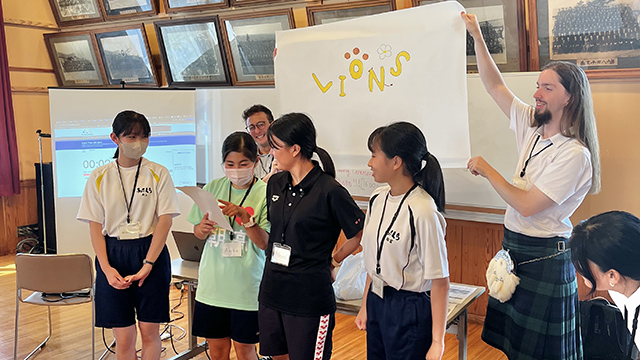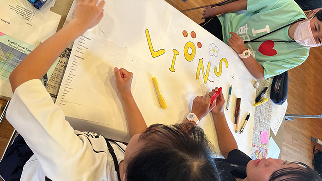 令和6年7月20日(土)、夏のイングリッシュキャンプが行われました。 本校同窓会館(一原堂)に参加希望生徒20名と本校&近隣校のALT8名が集まり、各国の文化や伝統的なダンスの説明・実演をしていただき、生徒たちとのダンス交流が行われました。午後からは、グループに分かれ『想像上のアイドル』をつくり、グループのロゴマークポスターを作成したものを英語で発表する、という活動を行いました。 生徒たちはダンスや発表を通じて、楽しみながら英語を学びました。