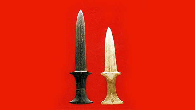 水稲耕作の技術とともに伝わったもののひとつに石製の武器がある。石剣の切っ先が刺さった人骨の存在から、弥生時代には戦いが行われたと考えられる。