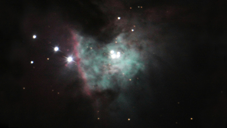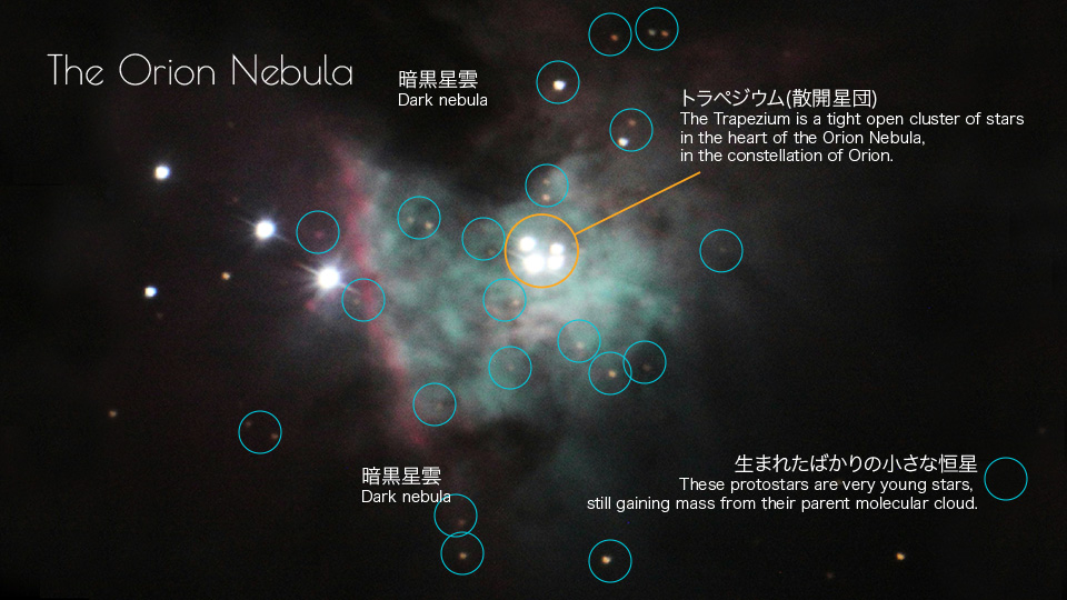 4つの明るい恒星(輝き始めたばかりの若い恒星で「トラペジウム」と呼ばれている)があり星雲を照らしている星であることがわかります。ガスやちりが密に集まってまだら状になっていたり、黒い影のような固まりの「暗黒星雲」(光を通さない濃いガスやちりでできている星雲)が存在している様子がよくわかります。その中心部分には、誕生したばかりの小さな恒星たちまで写っています。