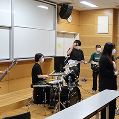 私たち音楽愛好会は月,水,金の週3回活動しています。活動内容はギター,ベース,ドラム,キーボードなどの楽器を主体にバンド音楽をコピーしたり,メンバーで合わせたりしています。発表会を目標にがんばっています。