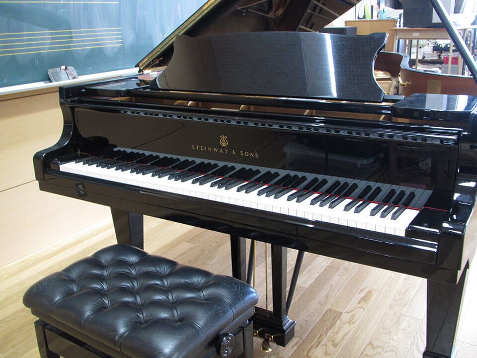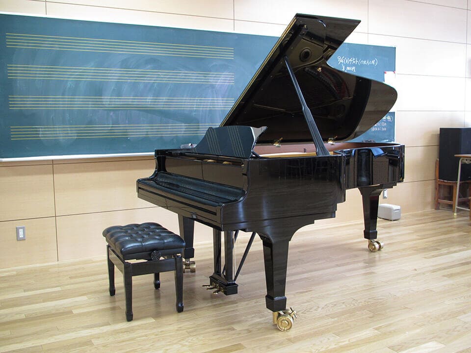 2009年に本校のOBから寄贈してたいただいた、スタインウェイ社製(ドイツ製)のグランドピアノです。スタインウェイ社は、世界的なピアノメーカーの一つであり、そのグランドピアノといえば世界の一流ピアニストも愛用しているピアノの最高峰です。