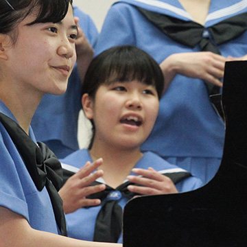 女子のセーラー服は、冬服は紺地に白の4本ライン、夏服は空色ギンガム地に白の4本ラインの爽やかな装いです。セーラー服の襟元は胸当てが無く、V字に開いています。これは、設立当初デザインされた荻野シズカ先生が、着物の襟元のV字ラインをイメージして作られました。