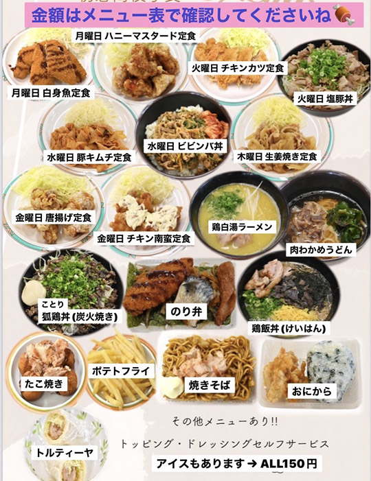 | 金曜日 | 唐揚げ定食 | 480 | チキン南蛮定食 | 480 | |