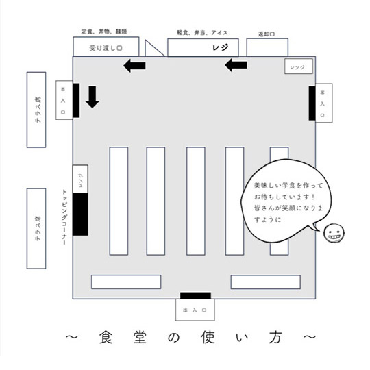 『食堂の使い方』をしっかりと読んで周りに配慮しながら譲り合いの気持ちで利用よろしくお願いします(^^)