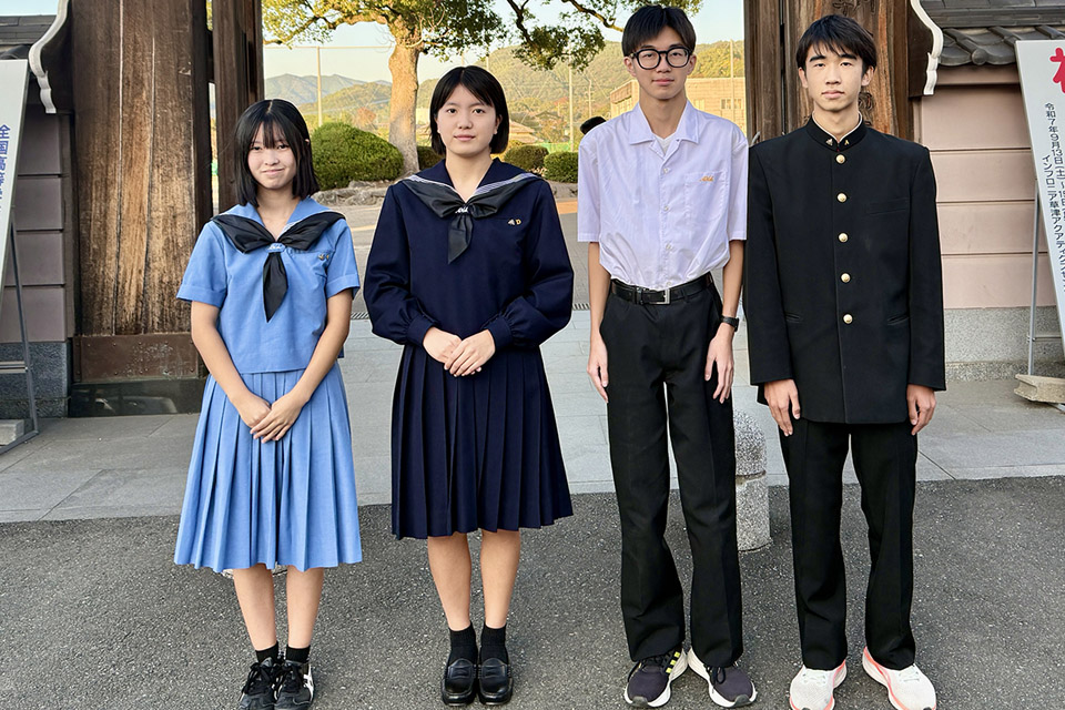 さらに、4本のラインがあしらってあるセーラー服は全国的にも大変珍しく、これは、旧制朝倉中学校・旧制朝倉高等女学校・旧制甘木高等女学校・旧制甘木中学校の4校が統合して朝倉高等学校となったことの意味が込められています。