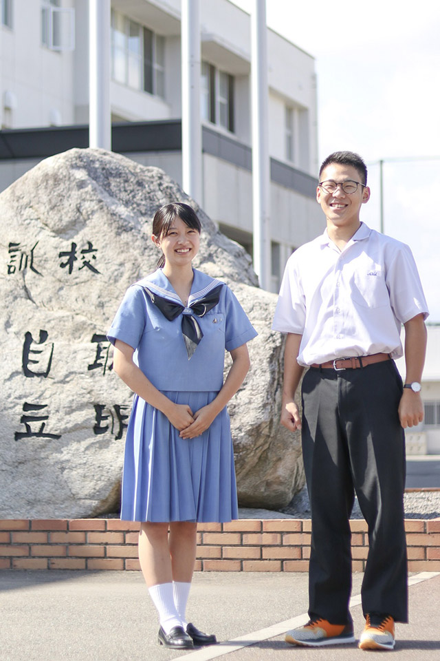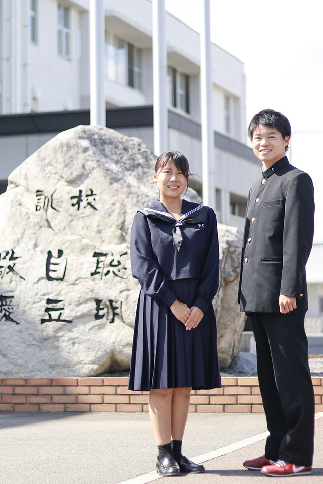 朝倉高校の制服は、創立から変わることなく受け継がれてきた、伝統ある学ランにセーラー服です。男子は襟元、女子は胸ポケットに校章とクラス章を付けます。